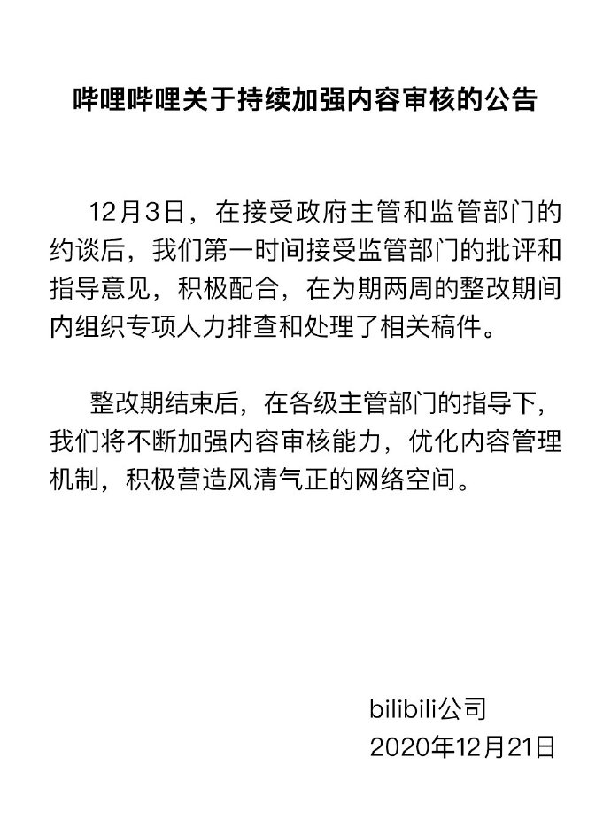 ,2020 年以来,全国“扫黄打非”办公室举报中心共接到群众反映 B 站问题的头绪逾五百条。依照转办头绪,上海市相关部门对 B 站行政立案处分 6 次,约谈 10 余次。近期,针对 B 站渠道存在的某些内容涉色情低俗等较杰出问题,全国“扫黄打非”办公室再次布置上海市“扫黄打非”办安排查办。12 月 3 日,上海市“扫黄打非”办联合市委网信办、市文旅局对 B 站进行约谈,责令其期限整改 2 周,全面排查违法违规和不良信息,加强视频、直播内容、漫画、图文及相关弹幕和跟评的审阅;一起明确要求,在检验网站整改作业合格前,暂停具有言论特点或社会发动才能的新事务新功能的内测或上线。