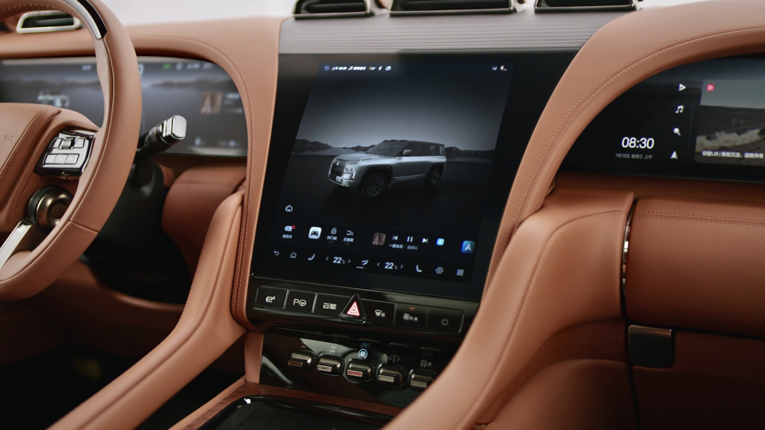 在对称的根底之上,仰视U8将天然人文中的舒适之美融入内饰空间规划细节,让全体造型浑然天成。以瀑布为造型创意,仰视U8创始12.8英寸星河曲面屏,演绎飞流直下的澎湃气势。R800曲率的车规级OLED柔性曲面屏与内饰天衣无缝,37°的最佳歪斜视点不只与两边23.6英寸的主副驾屏幕在空间上构成了前后景的层次交错,营建出悬浮的立体作用,还将人机工程布局调整至最优,最大极限快捷屏幕的操作并躲避反光。悬浮出风口以千山万壑的样貌,矗立在星河曲面屏之上,立体造型带来的激烈临场感让人似乎置身于瀑布前,感触舒爽惬意。